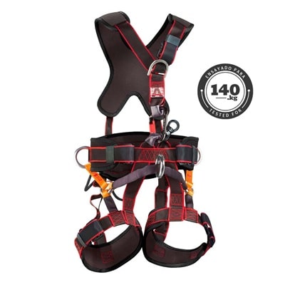 Dispone de dos puntos de anclaje anticaídas (dorsal y frontal) fabricados en hebilla D de acero de 8 mm. Incorpora un punto de suspensión giratorio, un punto de anclaje de suspensión ventral rotativo para disponer de movilidad lateral. La suspensión de estos puntos permite repartir la carga entre el cinturón y las perneras durante trabajos en suspensión. Los puntos laterales distribuyen la carga en el cinturón para situaciones que requieren posicionamiento. Además, cuenta con hebillas automáticas y perneras acolchadas para mayor comodidad.
