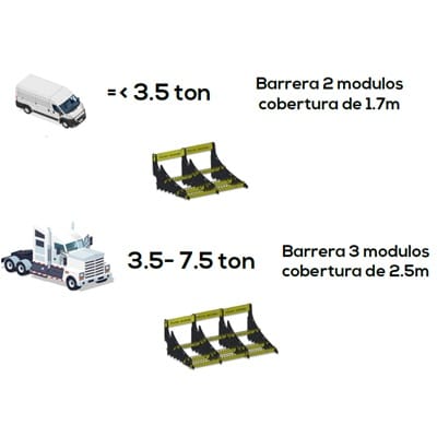 - Paneles con pichos para desinflar las ruedas delanteras y evitar que el camión siga circulando cuando la parte delantera golpea de vuelta en el suelo.