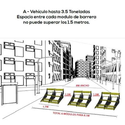 Los módulos no tienen que estar conectados cubriendo toda la anchura del acceso que queremos cubrir, si no que pueden haber huecos de no más de 1.5 metros entre una barrera y otra para asegurar de que por lo menos una de las ruedas del vehículo impacte con la barrera.