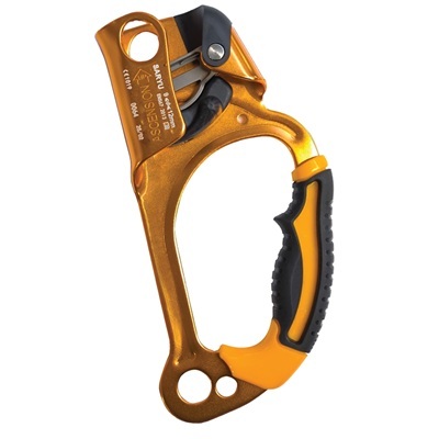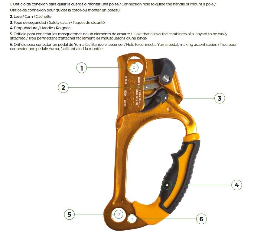 Estamos ante un aparato bloqueador de cuerda, diseñado para la progresión sobre cuerda fija. Está pensado con un diseño ergonómico y muy ligero, ya que está fabricado en aluminio. Puede trabajar con diversas cuerdas de distintos diámetros de trabajo de 9 a 12 mm. Dispone de orificio de conexión para guiar la cuerda o montar una polea, una leva de bloqueo, tope de seguridad, empuñadura, orificio para conectar los mosquetones de un elemento de amarre y orificio para conectar un pedal de Yuma facilitando el ascenso.