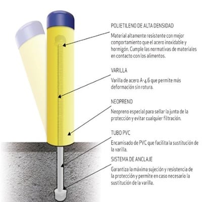 Es un bolardo de polietileno de color amarillo macizo con tapón negro, fabricado para proteger la parte inferior de puertas y esquinas ideal para zonas de reducido tamaño que necesiten protección. Incluye varilla de anclaje de métrica 30 milímetros.