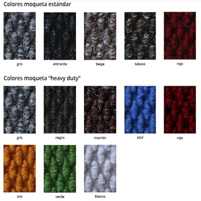 Los colores disponibles en estos Felpudos Metálicos Personalizados son Estándar: en color Gris, Antracita, Beige, Tabaco y Rojo y la gama de colores Heavy duty: que dispone de los colores Gris, Negro, Marrón, Azul, Rojo, Oro, Verde y Blanco.