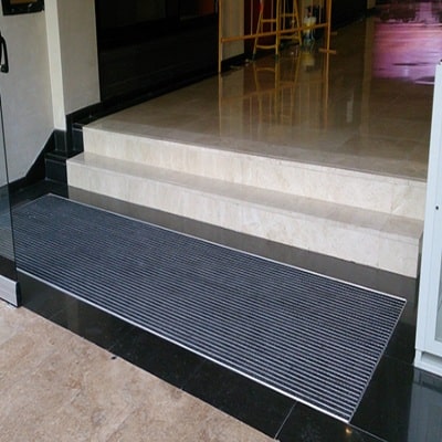 Los Felpudos Metálicos Personalizados son felpudos enrollables de alta durabilidad de 10, 13, 17, 22 o 27 milímetros de altura total, compuesto por perfiles de aluminio con inserción superior de moqueta, cepillo o caucho, cuyo principio de acción es el siguiente: las partículas de polvo, las pequeñas piedras, y la humedad se desprenden del calzado, depositándose entre los perfiles del felpudo, quedando así atrapadas. Cada cierto tiempo bastará con enrollar el felpudo y retirar la suciedad capturada, acumulada en el foso en el que se aloja. Puede fabricarse a cualquier medida y con cualquier forma. Se suministra totalmente terminado, no requiere ningún tipo de instalación o ajuste. Proporciona gran prestancia a las entradas de los edificios.
