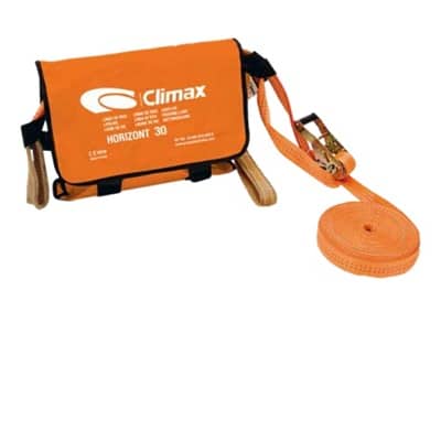 La instalación de la Línea de Vida Horizontal 30 Metros debe realizarse entres dos puntos de anclaje que estén situados a la misma altura y que soporten, al menos 15 kN. Fabricada con cinta de poliéster naranja de 50 mm con una longitud de 30 metros. Resistencia estática a la tracción F > 15 kN. Resistencia a la rotura por tracción estática F > 50kN. Comportamiento dinámico F < 6kN. (valor registrado en caída libre con masa de 100 Kg). Y un peso de 6 kilos.