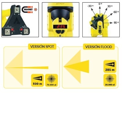 - Fuente luminosa: 70.000 cd (Spot) / 20.000 cd (Flood) / 500 lm.