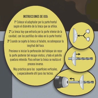 Este Recoge Virutas y polvo para Taladros está pensado para esos trabajos a realizar con brocas de diámetro 6 y 8 milímetros. Dispone de un diámetro de campana de unos 5 centímetros, perfecto para acumular el polvillo que se desprende al realizar varios agujeros en pared y techo. Es un sistema práctico de campana que sirve para taladrar todo tipo de tabiquería, techos o elementos panelables, recogiendo el polvo y las virutas que se producen al taladrar.