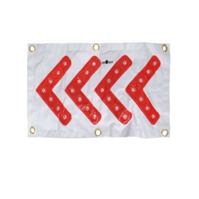 Esta es una señal direccional impermeable, fabricada en lona de alta resistencia blanca, con diferentes Leds Rojos en función del tamaño.