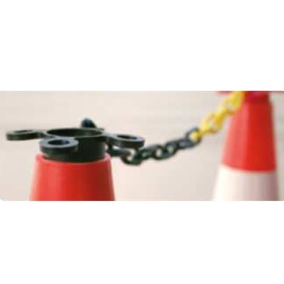 El Soporte Cadena Negro Conos para conos de señalización están fabricados en polietileno de color negro, están dotados de 4 argollas de Ø12 milímetros interior y Ø21 milímetros para soporte de cadena plástica tanto de 6 como de 8 milímetros.